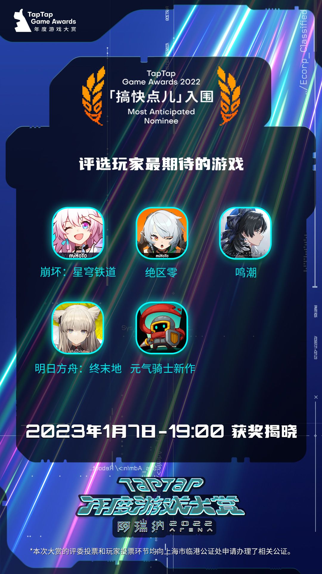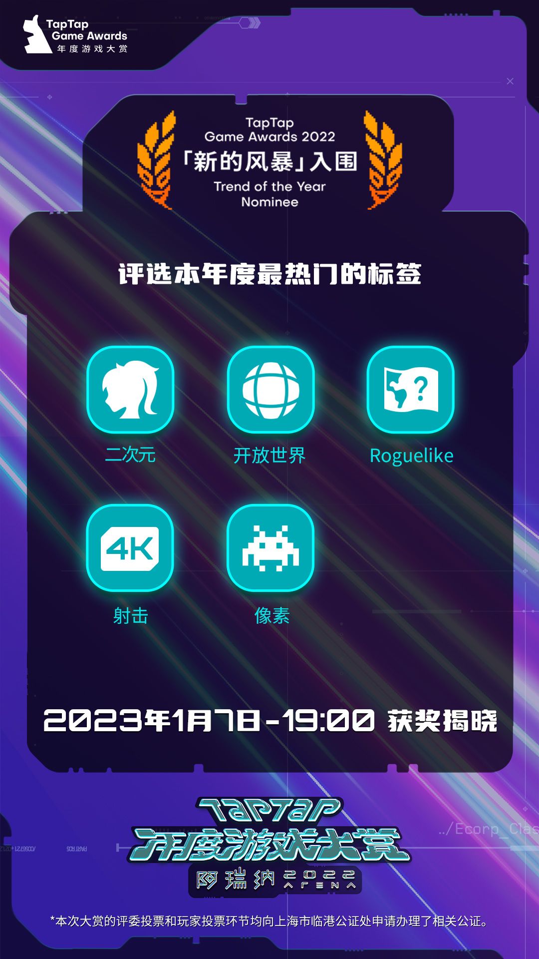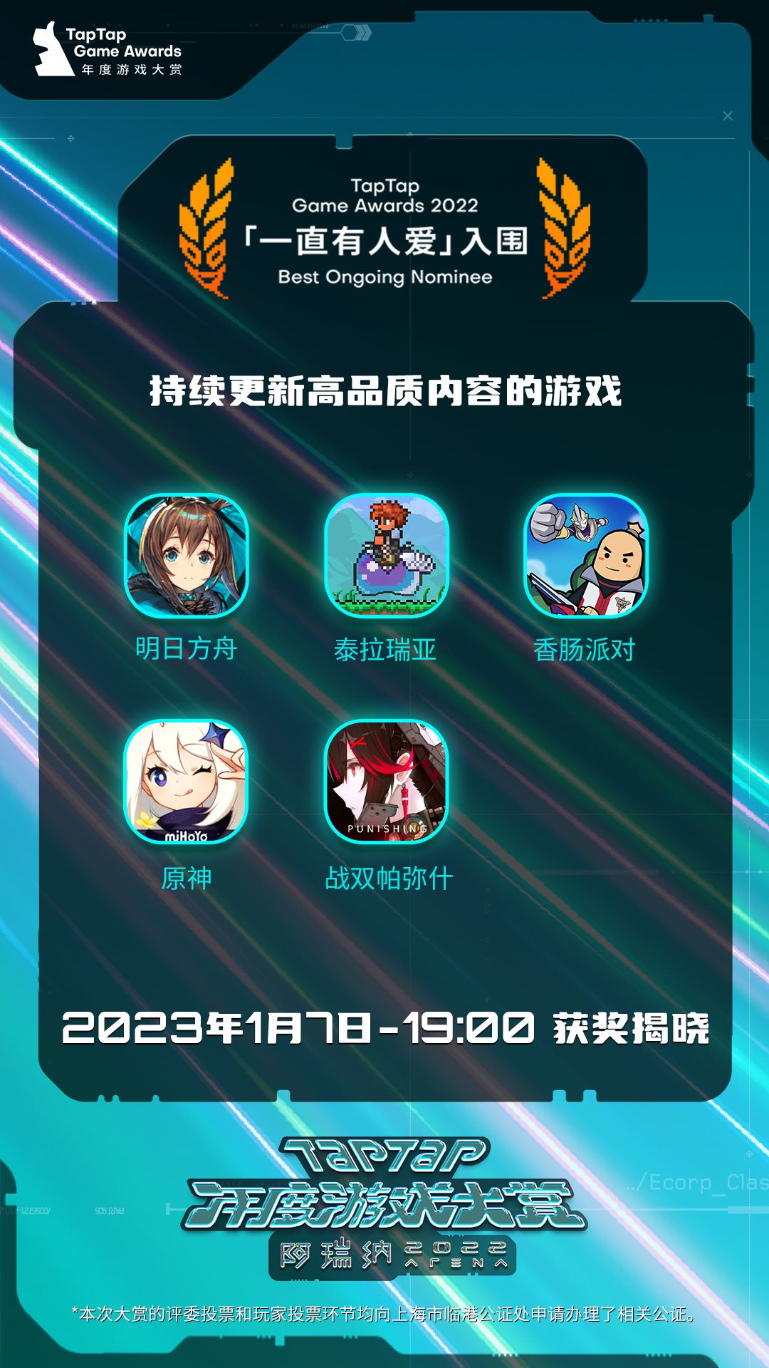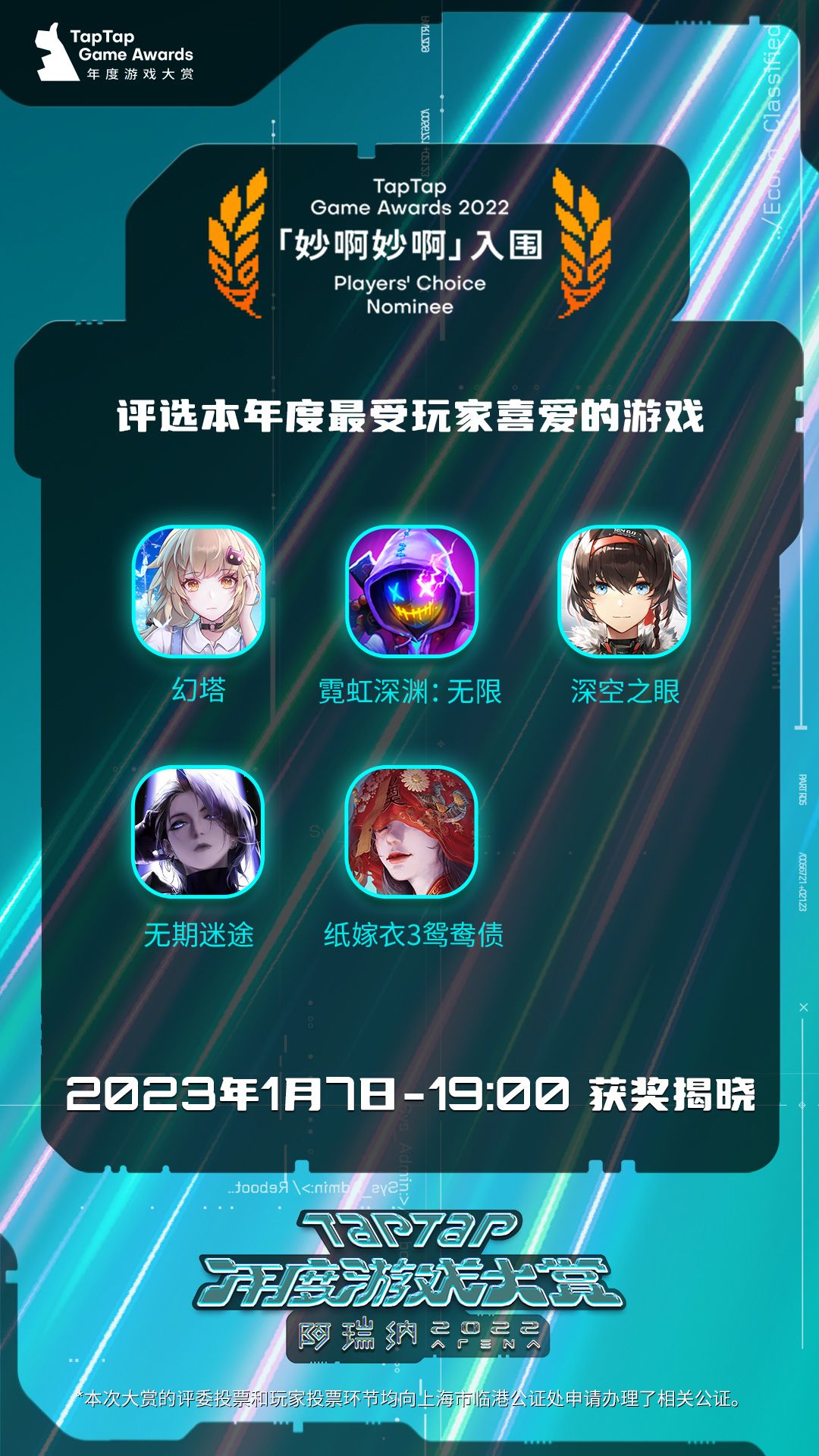 11个大奖入围榜单都公布啦~1月7日19:00 直播公布获奖游戏,记得来TapTap、bilibili、微博、虎牙、斗鱼、微信视频号、快手平台看