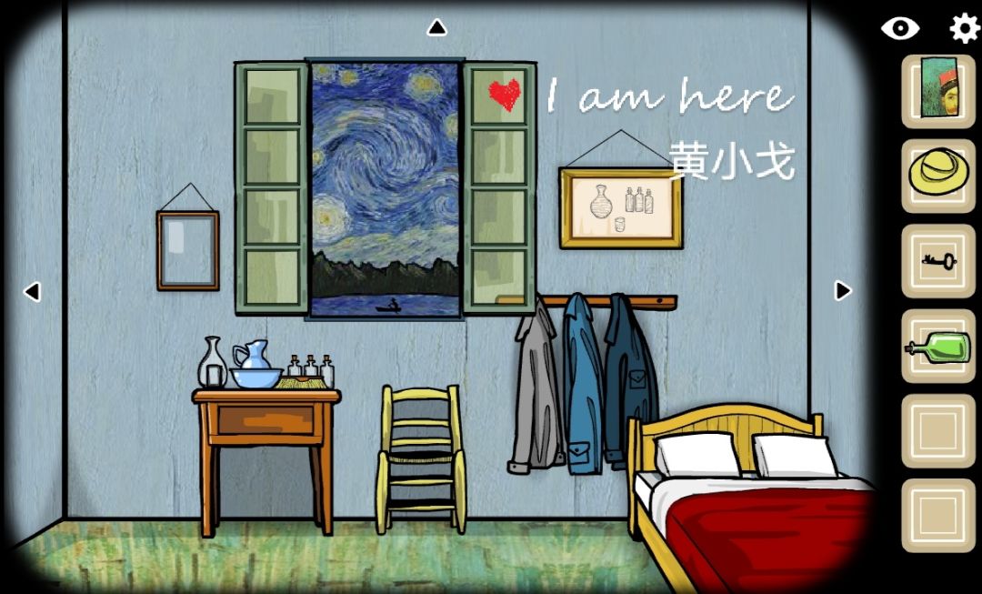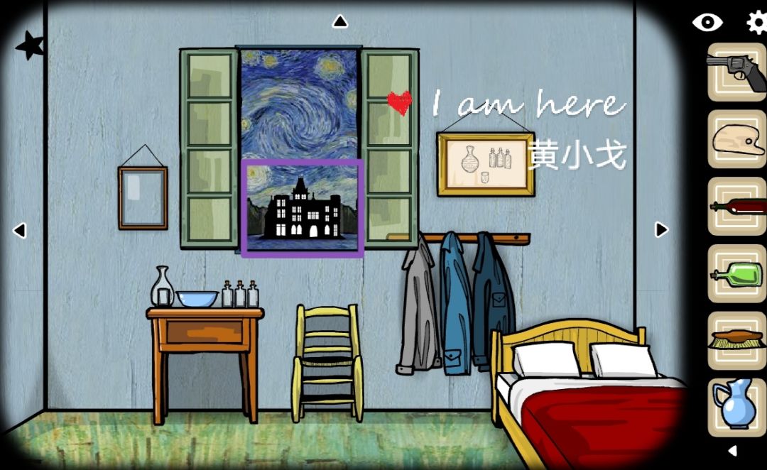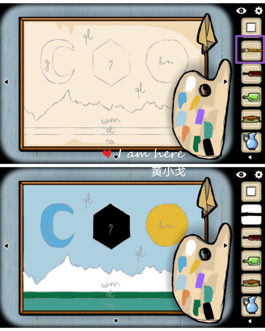 3.黑方块:(有门的房间场景)点击墙上的第三幅画,使用【调色盘】和【画笔】,画至相应的颜色,获得【黑方块】