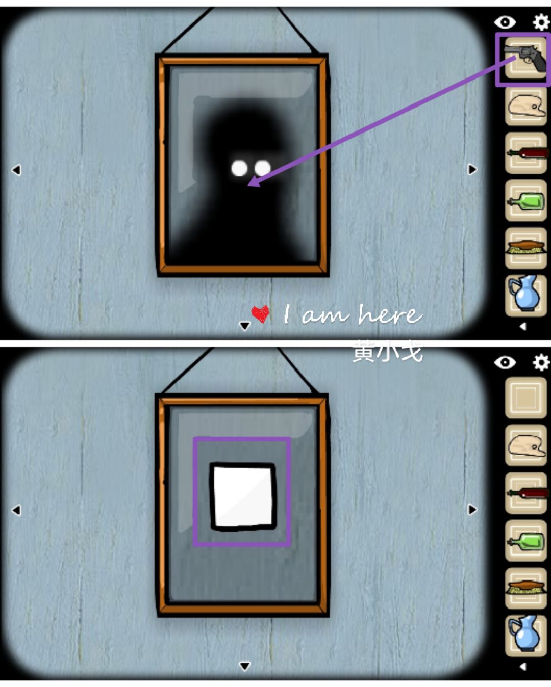 2.白方块:从耳中世界出来后,(有窗户的房间场景)点击墙上的画,把枪拿给小黑人,获得白方块