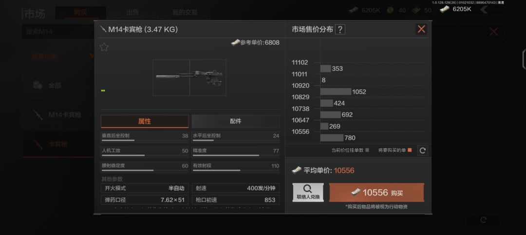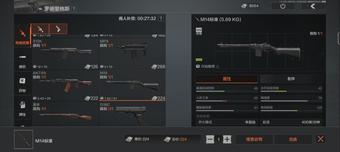 m14一把不错的枪224劵市场捡漏大约8000到10000,所以平均劵在1:35+,一天一把