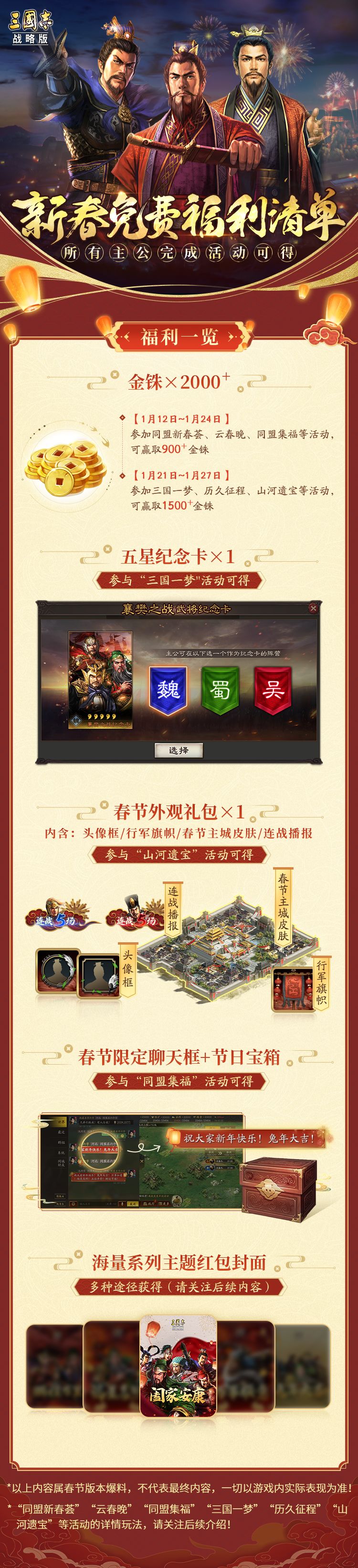 “三国一梦”全新活动、“历久征尘”“山河遗宝”等福利活动等主公参与!完成活动可免费得1500+金铢、五星纪念卡*1、春节外观礼包(头像框、行军旗帜、春节主城皮肤、连战播报皮肤)等,具体活动介绍请关注后续公众号推文,敬请期待!