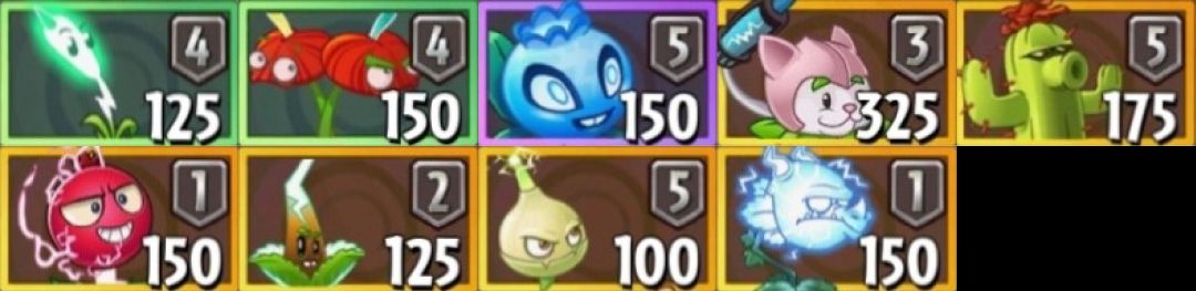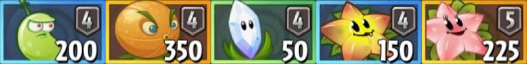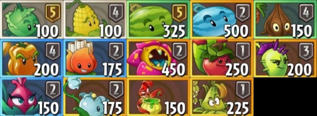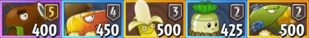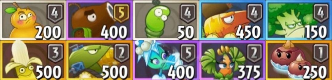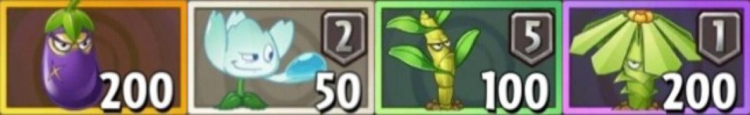 火葫芦、椰子加农炮、弹簧豆、胡萝卜导弹车、大力花菜、香蕉火箭炮、玉米加农炮、槲寄冰仙子、芭蕉舞蹈家、荸荠兄弟