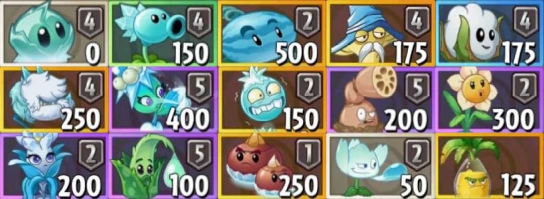 冰冻生菜、寒冰射手、冰西瓜投手、寒冰菇、棉小雪、冰龙草、槲寄冰仙子、寒冰醋栗、莲藕射手、水仙花射手、水晶兰、芦荟医师、荸荠兄弟、滴水冰莲、庆典汽水椰