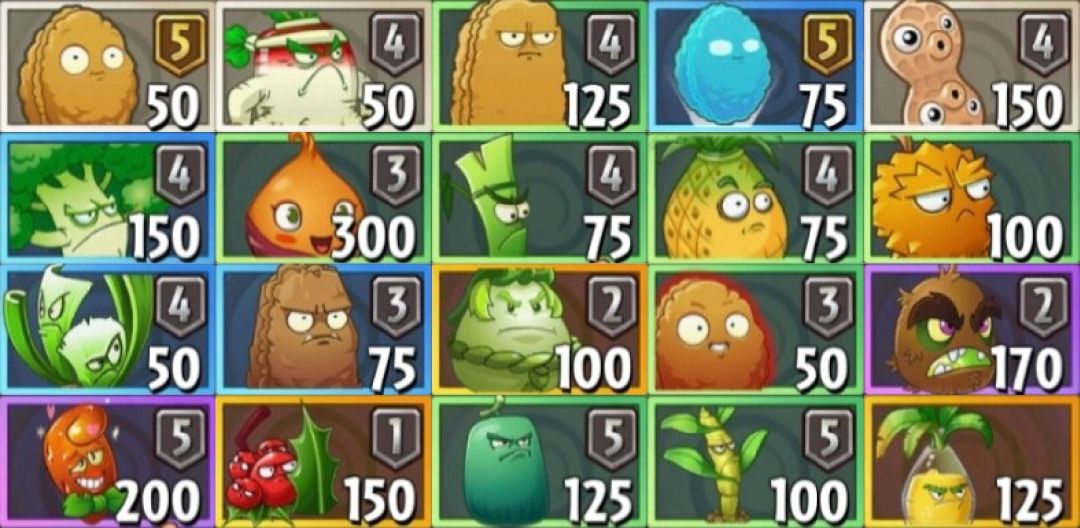 坚果、白萝卜、高坚果、全息坚果、花生射手、大力花菜、甜薯、竹小弟、旋转菠萝、榴莲、潜伏芹菜、原始坚果墙、白瓜相扑手、爆炸坚果、野兽猕猴桃、热辣海枣、冬青骑士、冬瓜守卫、石斛防风网、盛典汽水椰