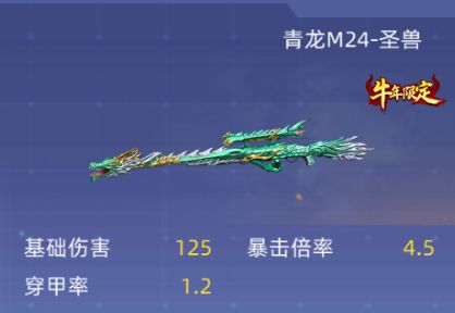 青龙M24-圣兽:御水乘风青兽起,溟河玉海潜苍龙。圣兽青龙降临边境世界与M24狙击枪融为一体,拥有技能:青龙睛:瞄准敌人时,瞄准镜将锁定目标,并且可以穿透烟雾发现敌人。基础伤害125,暴击倍率4.5,穿甲率1.2,射速50,跑速0.77,换弹2.2,弹夹数15/60,精准99,生化伤害倍率2。超强的sss级狙击枪,在对局中开镜之后相当于多了个自瞄buff,枪枪致命!拥有超高的射速非常适合甩狙。