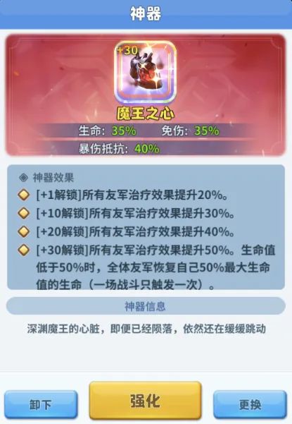 新深渊灾劫神器【魔王之心】能提升英雄生命、免伤和爆伤抵抗,神器效果是提升所有友军的治疗效果,同时随着等级提升还能恢复全体友军的生命值,是一件适合辅助英雄和前排承伤英雄穿戴的神器。生命、免伤和爆伤抵抗属性提高了穿戴该神器英雄的生存能力,恢复全体友军的生命值配合全体友军治疗效果提升,更是进一步强化了全体友军的生存能力,能够在瞬间对整个战局起到决定性的作用。