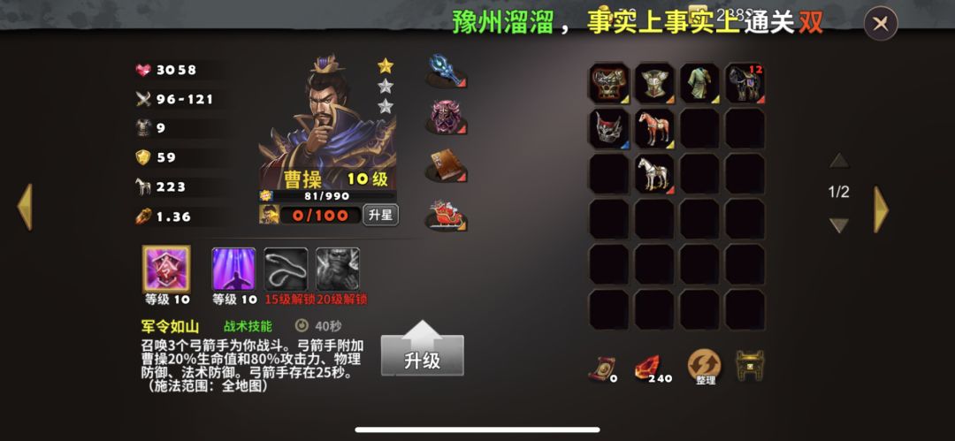 英雄不能使用刘关张,所以只能选择曹操、夏侯惇,曹操、夏侯惇装备如图所示,防御塔使用天雷塔、寒冰塔,战术卡使用破敌、练兵、乱敌、术塔精通。