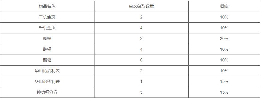 2、可抽取:红影千机页、鹊翎、华山论剑礼袋、神功积分券等超值大奖,100%中奖率!