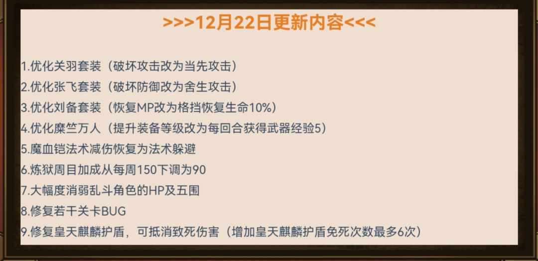 原万人斩技“装备等级+6级”,还是挺有趣、挺新奇的技能,吸引糜粉们去刷。这次更新,直接削了,更改为“每回合武器经验+5”,直接沦为:鸡肋!