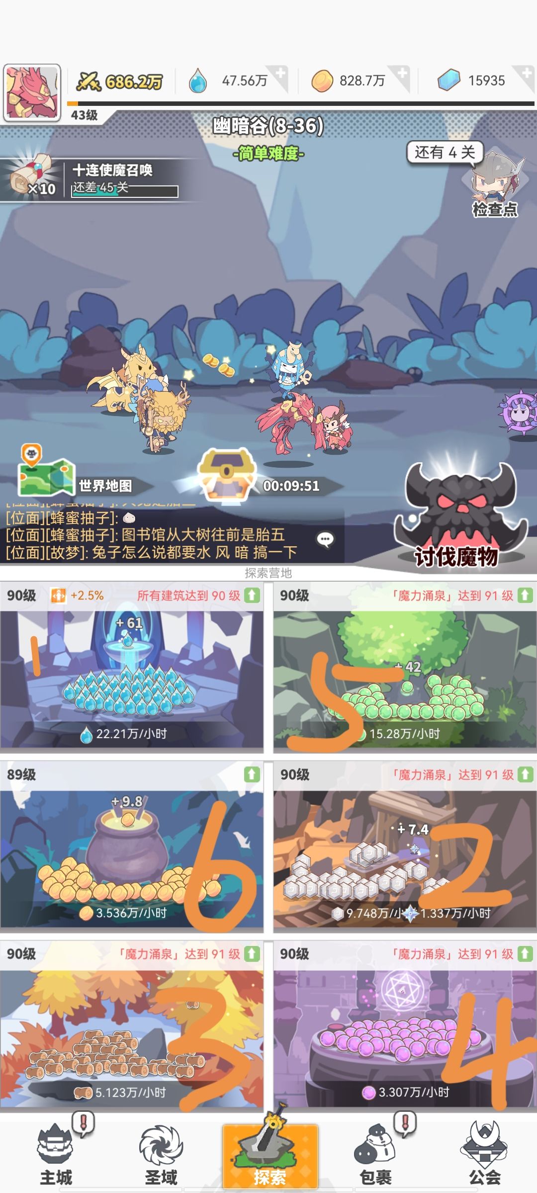 首先是探索里这六个资源的升级优先考虑。如图所示,第一个魔法泉水是最重要的,它决定了其他5个资源的产量。第二个是装备部位强化及升星,之所以把它考虑在第二位。是因为,不管是装备部件的强化及升星都有很大的加成。且强化部件需要的材料往往都是最充足的。第三个是时空裂缝里三围属性的加成材料,这个点用的很多,但是不会出现大量的升级材料短缺。第四个为神格材料,往往神格是最整个阵容最大的输出条件,但为什么我们选择第4个升级呢。是因为神格升级时,需要大量的经验及突破神格等级时需要的魔法祭品是有很大的缺口的,我们在2/3位保证了战力不停滞的情况下,可以有时间来囤积神格的所需物品。第五个是使魔升级的经验。由于是零氪。我们后续还有很多地方需要钻石去提升战力,所以我在前面也说过,作为零氪,最重要的是耐心和财力的短缺。所以我建议的是不花钻石在商店里购买除占卜珠及打折的召唤劵以外的其他物品。在囤积经验的同时也能有时间获取突破石。第六个就是金币,由于占卜珠的获取方式中,我们需要购买10次金币,所以我感觉金币我们往往是有剩余的,不需要优先升级。