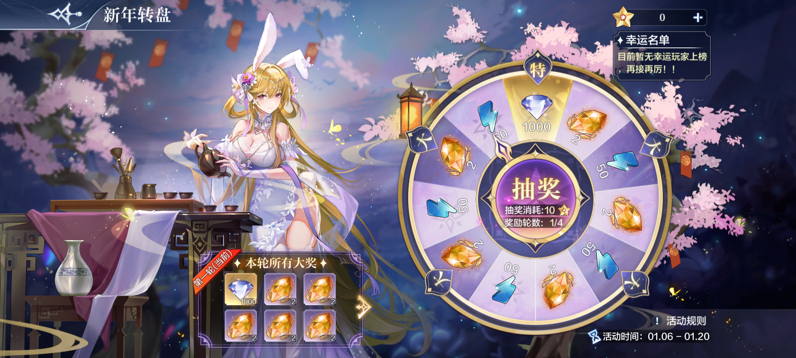 活动内容:参与离阳纷争、元旦大富翁活动即可获得幸运星,每消耗10颗幸运星即可开启一次幸运转盘!总计4轮抽奖,若抽中特等奖,本轮所有奖励将直接获得,并进入下一轮抽奖噢!