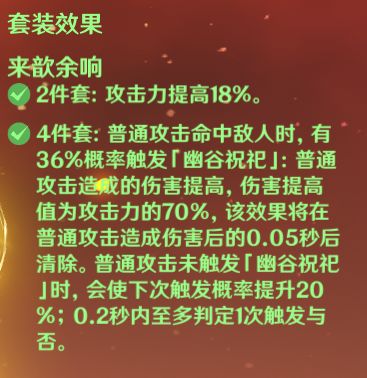 首先是配装方面。神里绫人的圣遗物选择基本集中在来歆余响、沉沦之心、角斗士的终幕礼三个四件套上,攻击沙、水伤杯、双爆头也是无疑的标配,基本没有调整余地。三套圣遗物中,余响套的加成在基础伤害区间,基本可以视作是另一种攻击力加成,而水套和角斗士套的增益集中在增伤区间,两者对绫人差别很小。当武器选择绿剑时,由于特效不提供任何增伤且加成了不少的攻击力,这时提供增伤的水套和角斗士套通常会比余响更优;同样的,当选择波乱、雾切、黑剑等增伤型武器时,余响会比另外两套圣遗物略优一些,大家可以根据武器提供乘区的不同,在选择圣遗物时进行权衡。