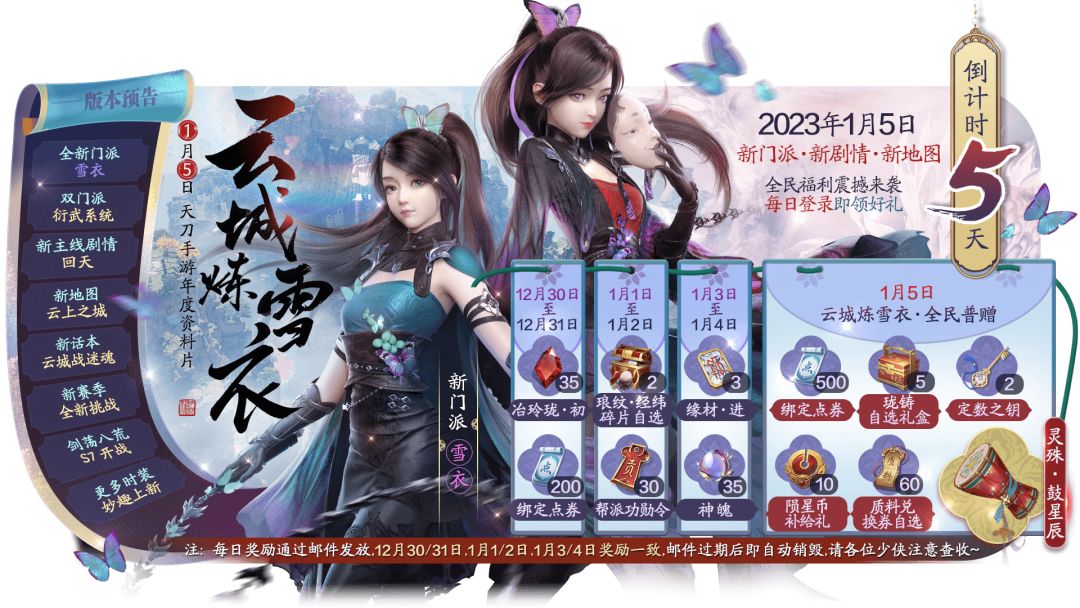 年度资料片《云城炼雪衣》倒计时2天啦,即日起登录游戏即可领取资料片倒计时好礼!1月5日当天登录还可领取限定饰品【灵殊·鼓星辰】~