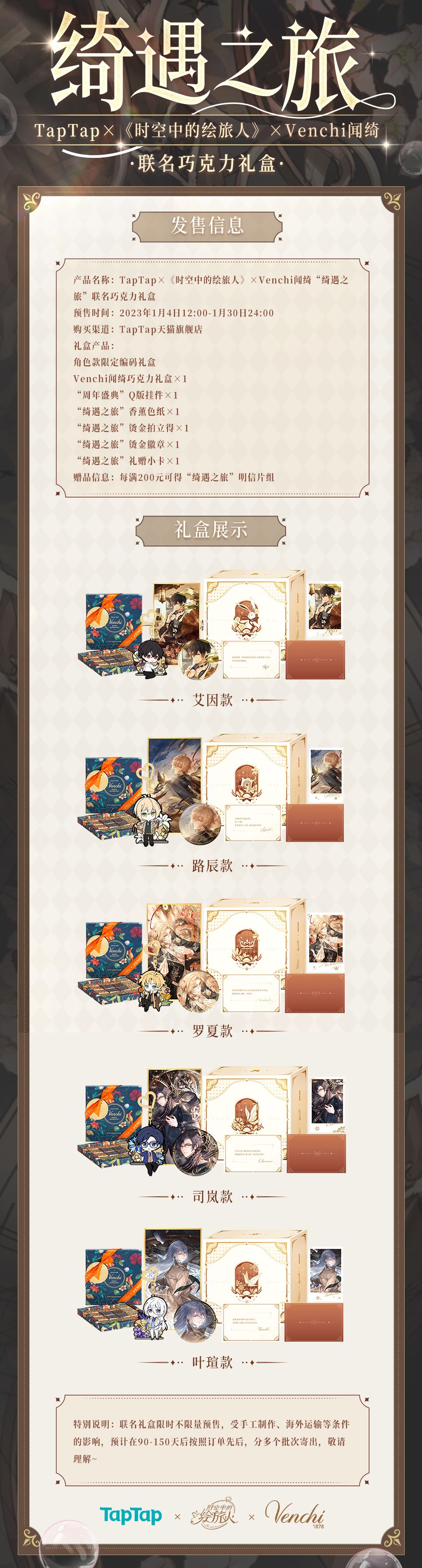 【💝联名礼盒】开售情报来了!重磅!TapTap×时空中的绘旅人×Venchi 携手为大家带来的「绮遇之旅」联名礼盒及系列周边即将开售!