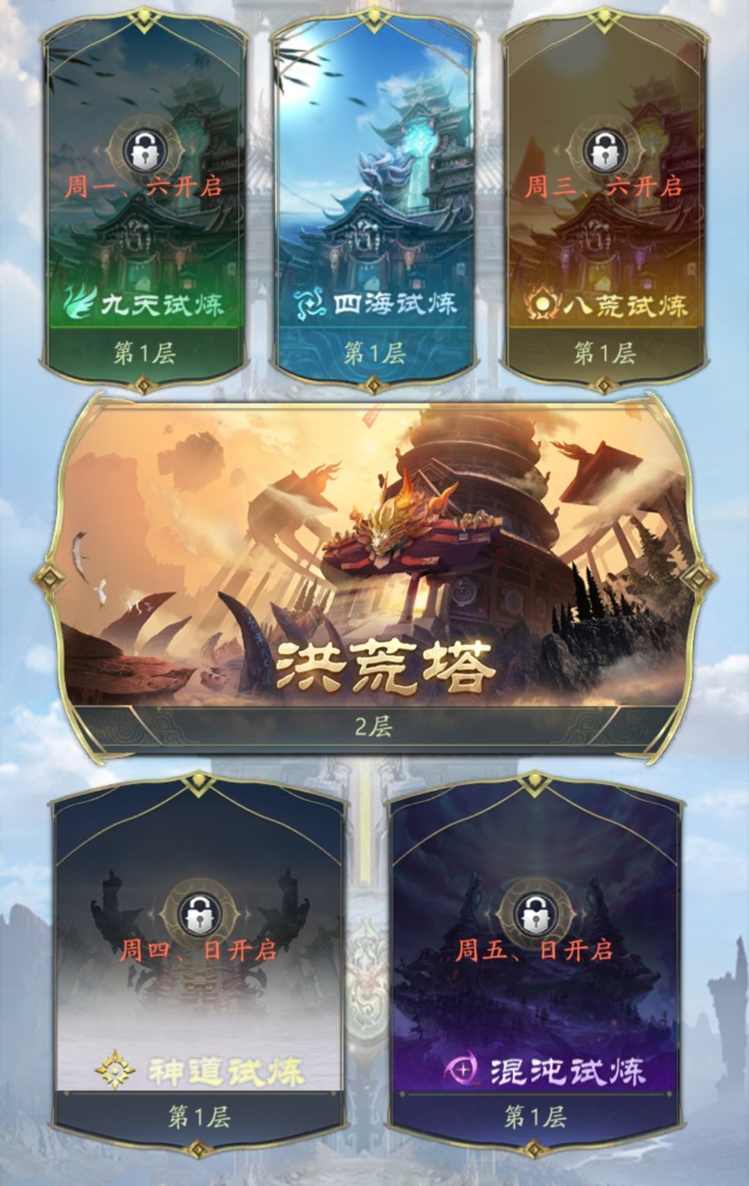 除洪荒塔以外,还有九天试炼、四海试炼、八荒试炼、神道试炼、混沌试炼等试炼副本供元灵大人探索。