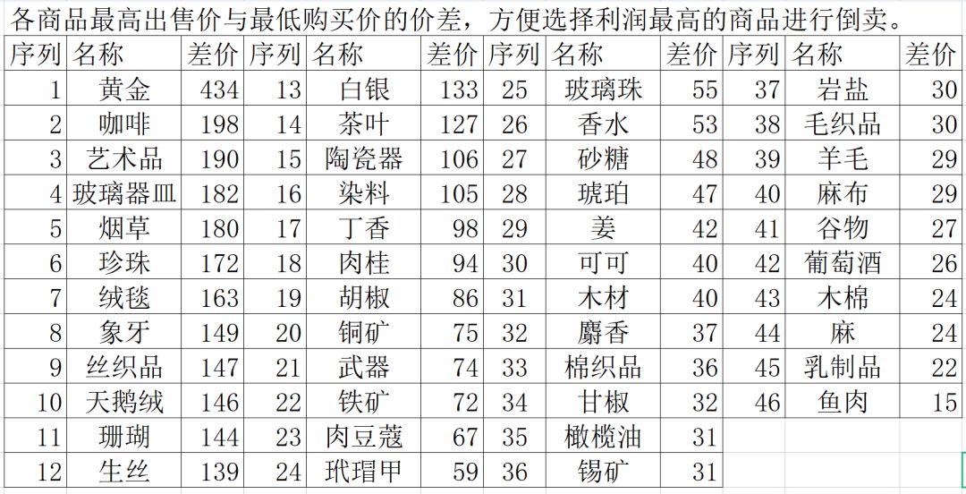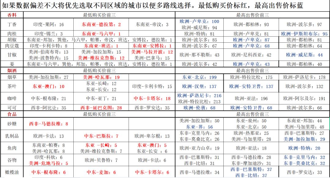 欧洲低价盛产葡萄酒,天鹅绒,棉织品,高价回收:香料,贵金属,宝石,奢侈品,烟酒。 中东低价盛产:咖啡,橄榄油,岩盐,木棉,羊毛,毛织品,绒毯,香水,麝香。高价回收武器,贵金属也有一定销路。 印度低价盛产:茶叶,麻,麻布,铜矿。高价回收:陶瓷器,琥珀和贵金属在部分地区也有一定销路。 东南亚低价盛产:胡椒,姜,肉桂,除了部分地区高价收糖和黄金,其他地区基本啥也不收!(土包子不识货是吧!) 东亚低价盛产:茶叶,鱼肉,珍珠,艺术品,陶瓷器,白银,丝织品,麻布。高价回收:砂糖,象牙,染料,玻璃器皿 西非东非低价盛产:砂糖,可可,染料,麝香,象牙,岩盐,黄金。高价回收:玻璃珠,乳制品,谷物,橄榄油,只收玻璃珠和吃的!(土包子不识货是吧!) 美洲低价盛产:烟草,染料,甘椒,黄金。高价回收:棉织品,砂糖(没错,就是凑数的,土包子不识货!)