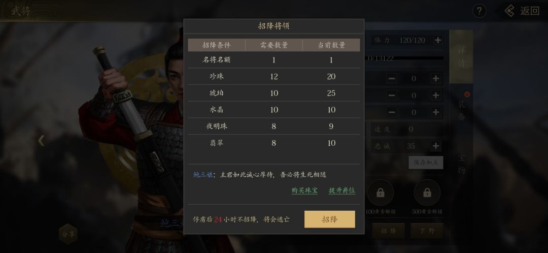 6、完成以上步骤以后,我们会在信件里看到成功抓捕鲍三娘的信息。将领俘虏后会出现攻占队伍的出发城里,这时我们可以回城使用“宝珠”(宝珠可以通过商城购买、采集、活动获得)对将领进行招降,并提高他们的忠诚度。