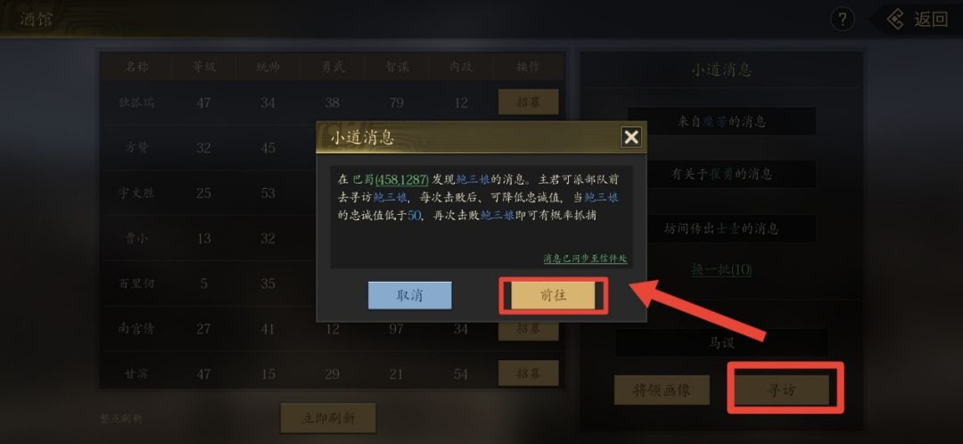 3、点击将领名字跳出弹框,到酒馆进行寻访,获得将领的坐标和画像。