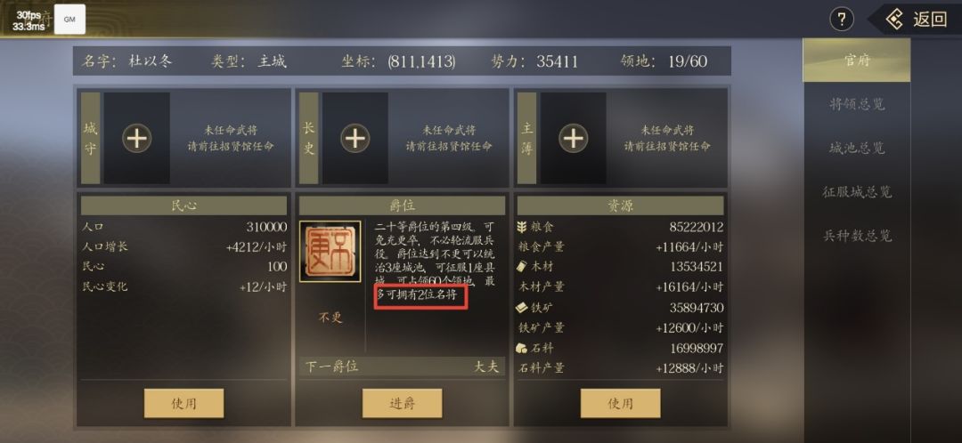 4、在获知将领的坐标以后我们要以最快的速度到达,防止他人捷足先登。我们可以带两万轻骑快速抵达,如果距离跨州距离过远可以考虑在内政里面的“君主”使用低级“迁城令”将城池迁往附近,然后使用计谋“千里奔袭”即可继续攻占(ps:军师每1点智谋可加快行军速度1%,所以任命智谋高的将领可更大程度地减少行军时间)。如果距离较近那就直接攻占就行了。