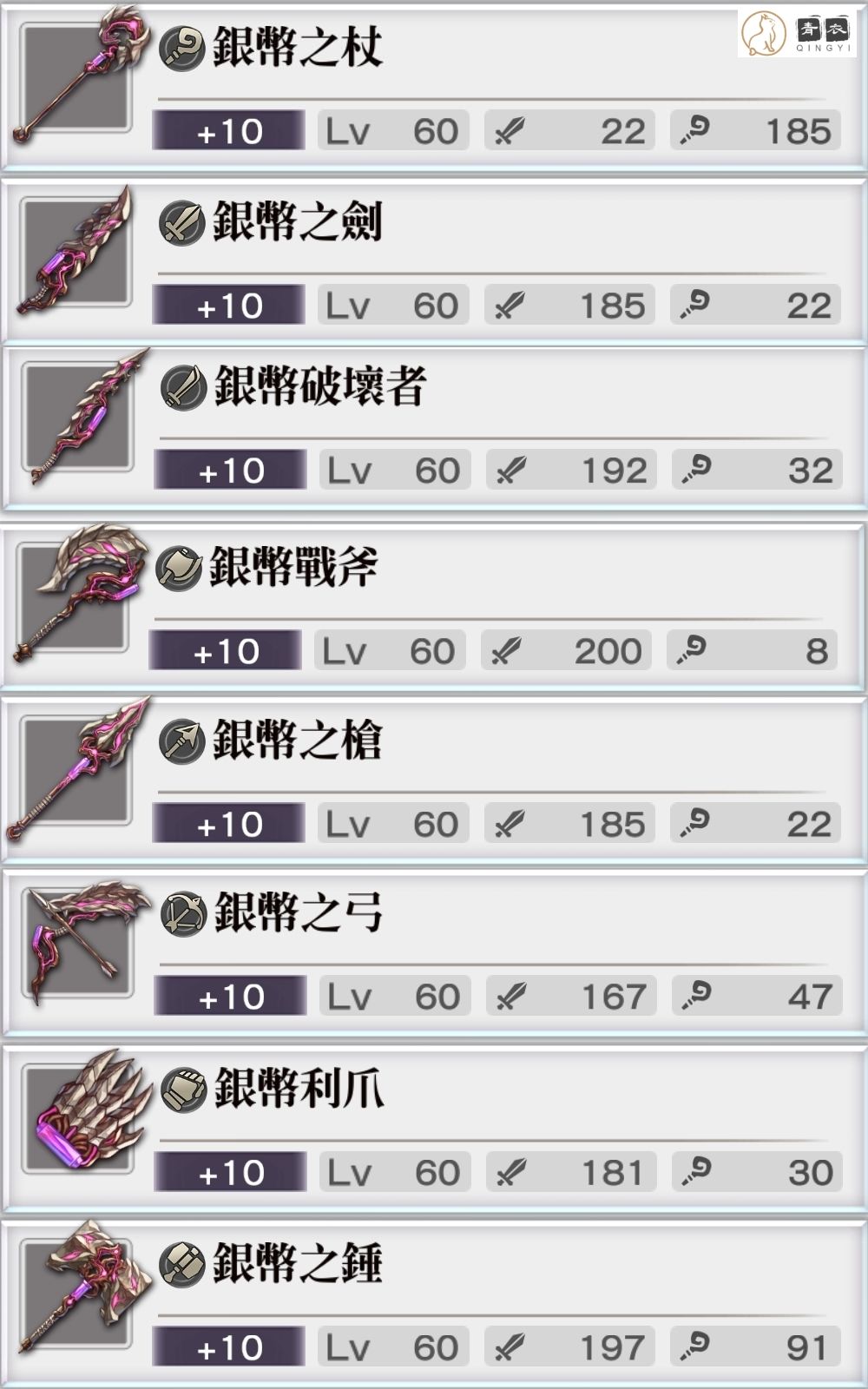 🔹武器属性:【银币系列武器,可强化至+10】以剑为例: