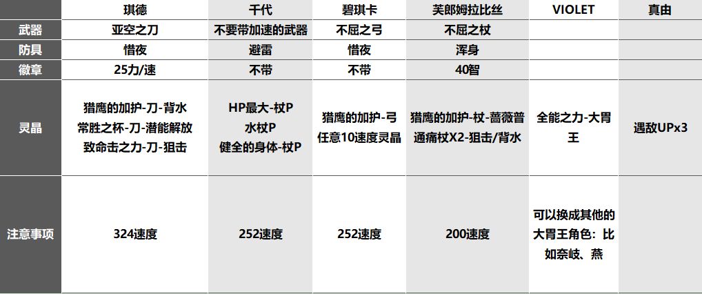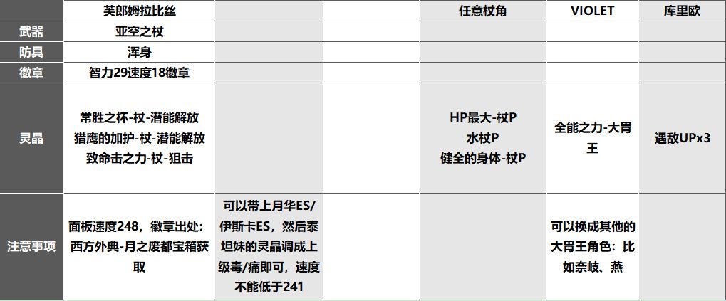 后者因为遇敌DOWN,所以只需要堆伤害足够瞬杀隐王/FEAR即可,比较简单,甚至可以把前者构筑的队伍遇敌UP直接拆了换成DOWN就行,然后去掉队友尽量1-2动省事即可,后者队伍我就不写了;