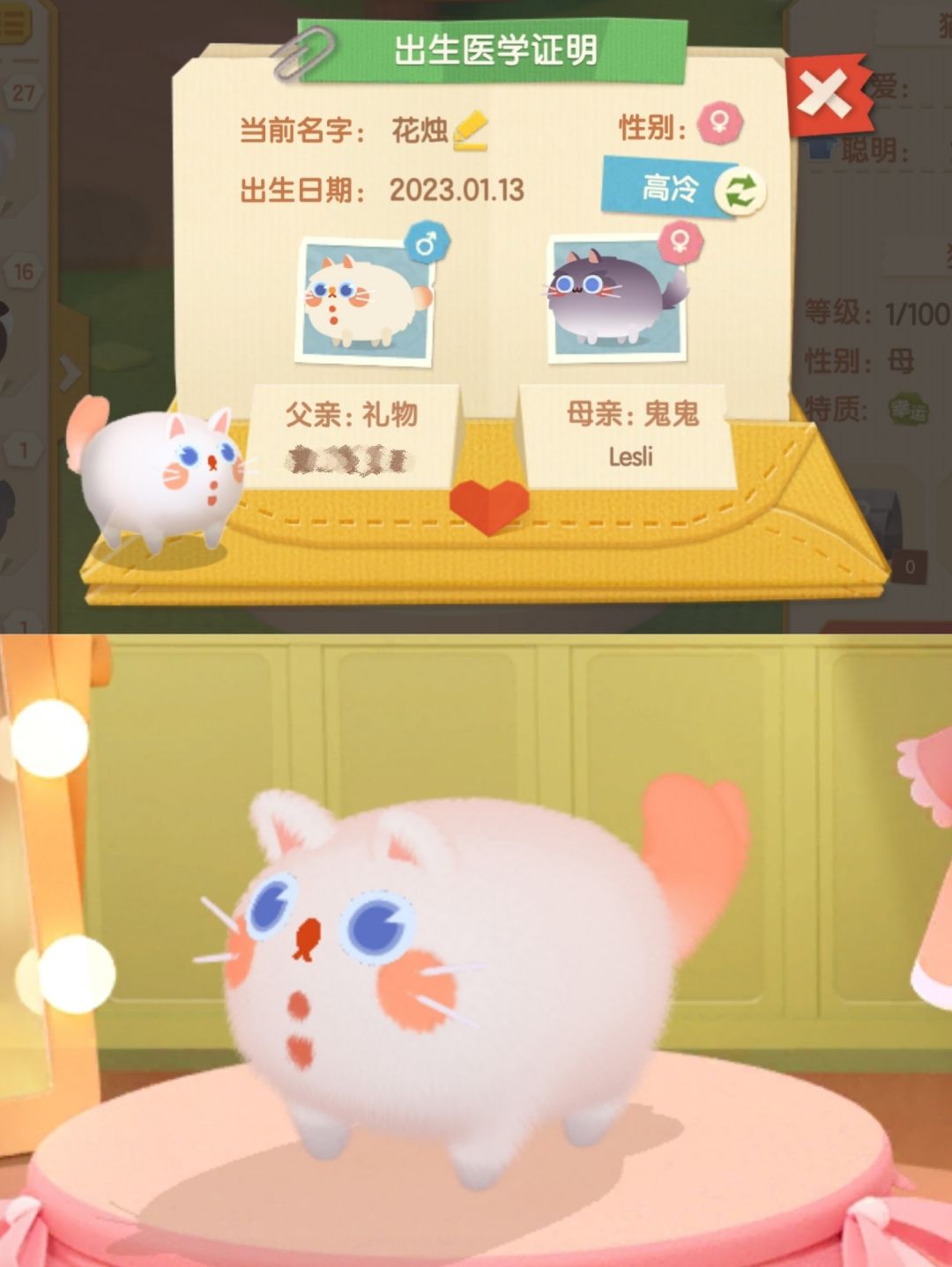 格子只有20个,我又不舍得送养,所以生得很慢,以后可能除了攒满变异果或者为了任务都不会怎么生,虽然我也有点想试试各种漂亮猫配种生出漂亮小猫,或者不断不断生总会遇到二代战神,但我是个微氪现在除了买家具钱不敢乱花,莉莉丝家具那么贵!萌装池子四级也死贵!总之就是佛系生崽,没有那么大执念啦😇吐槽游戏的那么多 能让我玩下去的很大一部分真的就是可爱猫猫😽