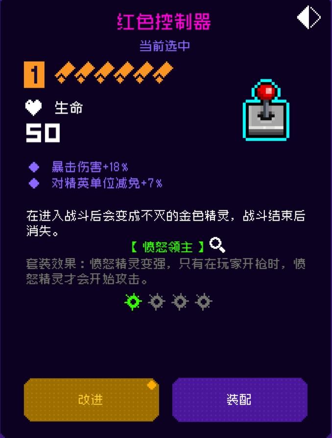 红色控制器(四号位)可以将你产出的红色愤怒精灵变成金色愤怒精灵,这两种愤怒精灵的区别就在于金色的愤怒精灵可以一直在场上,而红色的愤怒精灵对敌人进行攻后就会消失,也就是说这个纪念品对杏鲍菇起的只是一个辅助作用。当你带上这个纪念品就不用再去对局里跳跃去攒红色愤怒精灵了,这也大程度的缓解了生存压力,让自己可以去认真的走位