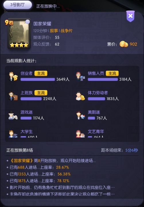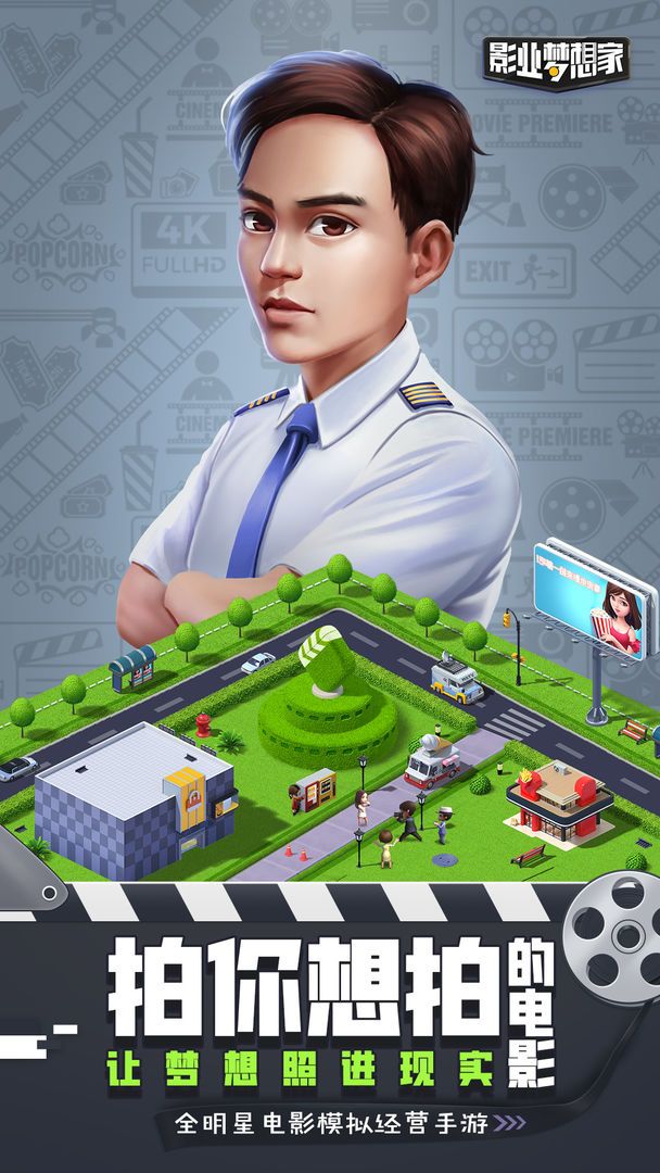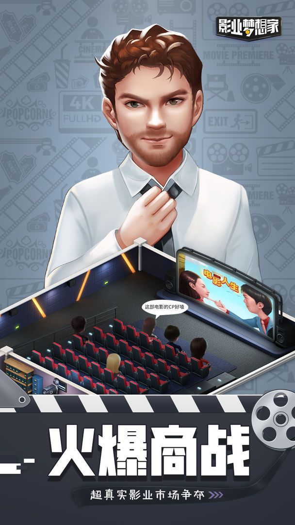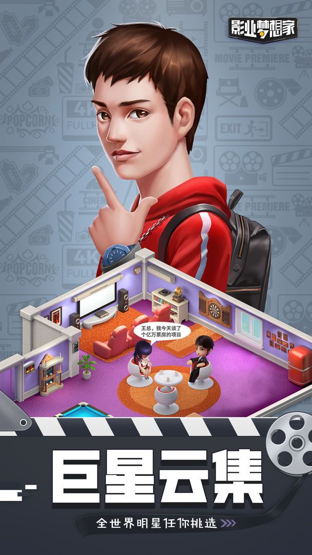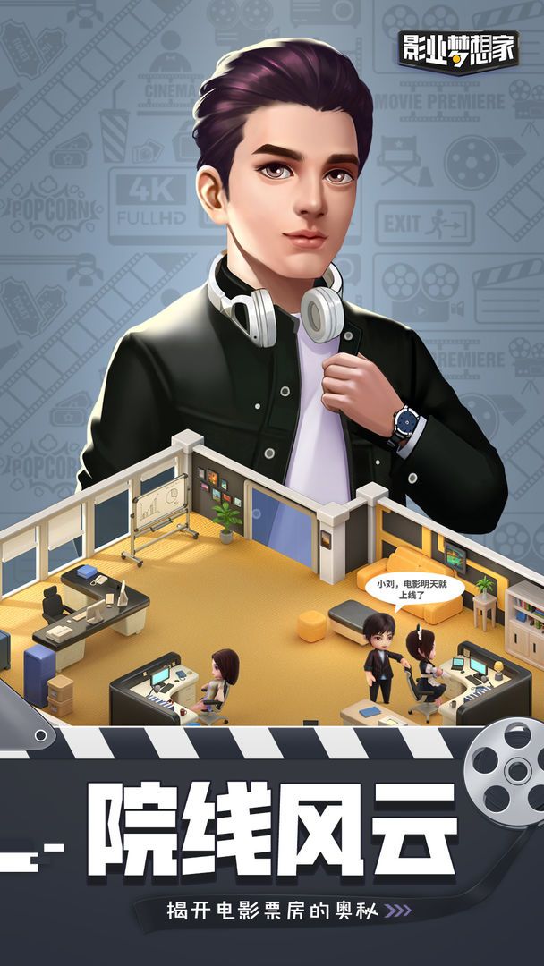 电影院排片你所拍摄的电影,销售周边商品,完成粉丝任务,赚取美元的途中收获更多的观众与粉丝,也可以与好友经营一个合作影厅增加你影院的收入