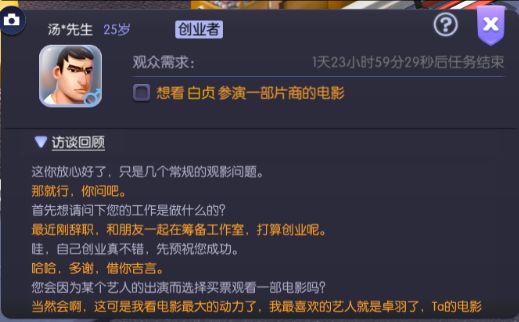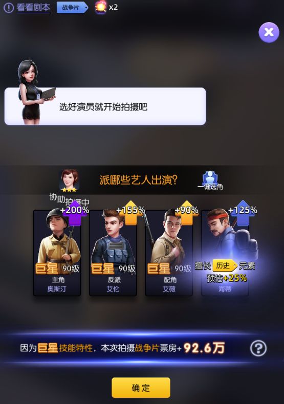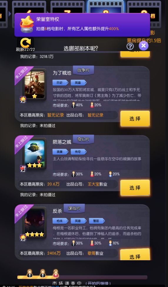 游戏中核心玩法,使用你的艺人挑选最合适的剧本、角色、内容类型进行拍摄,你的决定将会影响电影的总体质量,所以你是选择当下流行片还是以你的艺人为主拍摄电影呢?