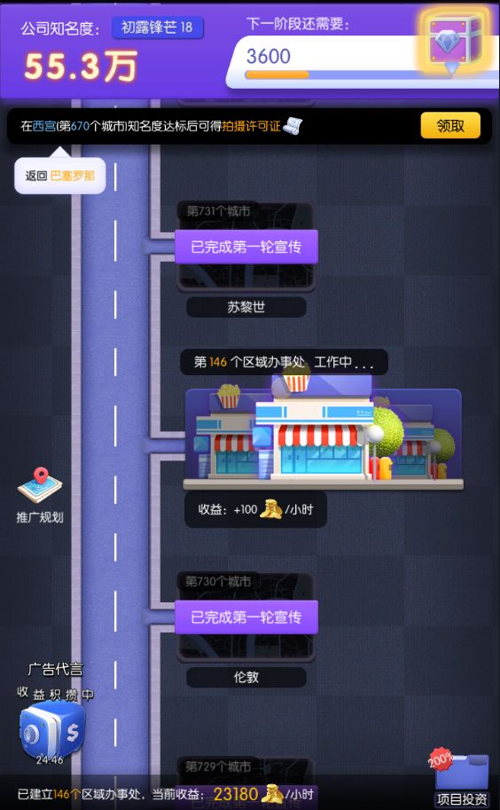 在世界各地进行宣传建立办事处增加你公司的知名度与在市场收益,适当的进行项目投资获取金币