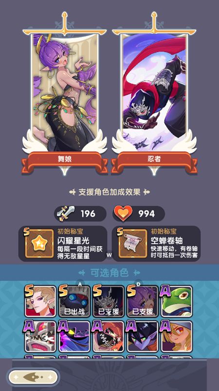然后支援角色尤其推荐舞娘或是忍者。我们知道,支援角色的效果主要是带着ta的初始秘宝进入战斗,而舞娘的“闪耀星光”可以隔一段时间进入无敌效果,周期性快速清怪和捡拾道具,相当好用。忍者的初始秘宝“空蝉卷轴”,可以抵挡伤害从而提升容错率。如果两个都有同时助战自然是会更轻松啦~