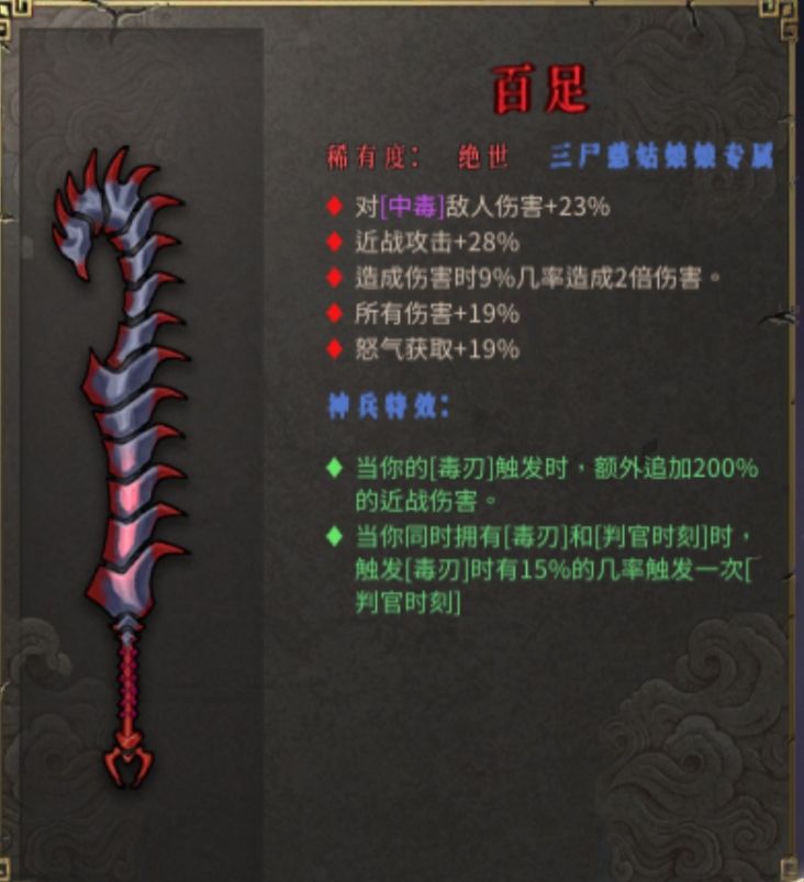 百足触发毒刃后会额外造成200%近战伤害,并有15%利率触发判官。