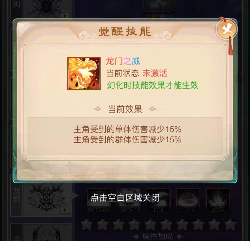 在配置凶兽的时,部分凶兽的觉醒技能以及普通技能都会有PVP的伤害减免。这里小编优先推荐龙鲤。其中部分凶兽也有伤害减免但它在凶兽中减免伤害最多。具体就是它的觉醒技能——龙门之威,会为主角受到的单体伤害减免15%,群体伤害减免15%。