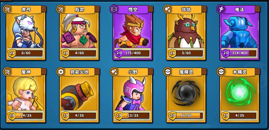 开局:优先上虎弓、后羿,然后上悟空、咕咕、电法、爱神、火炮。除猴子外全部拉满,电法、虎弓、后羿优先满星。