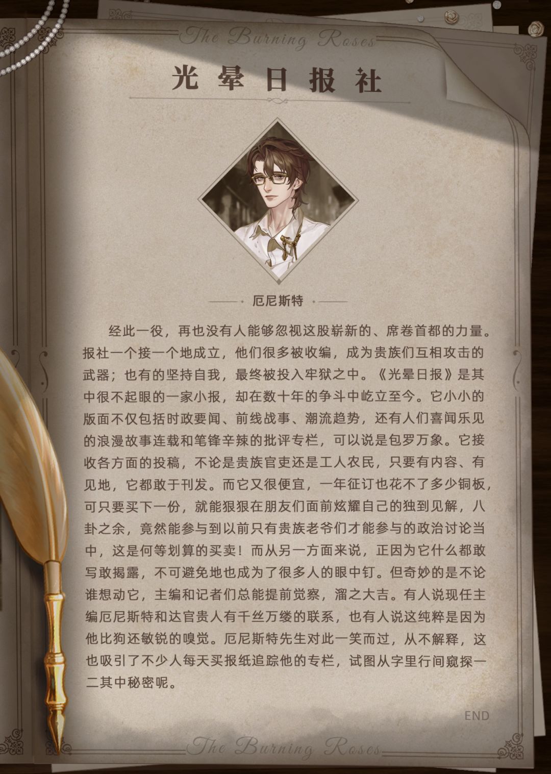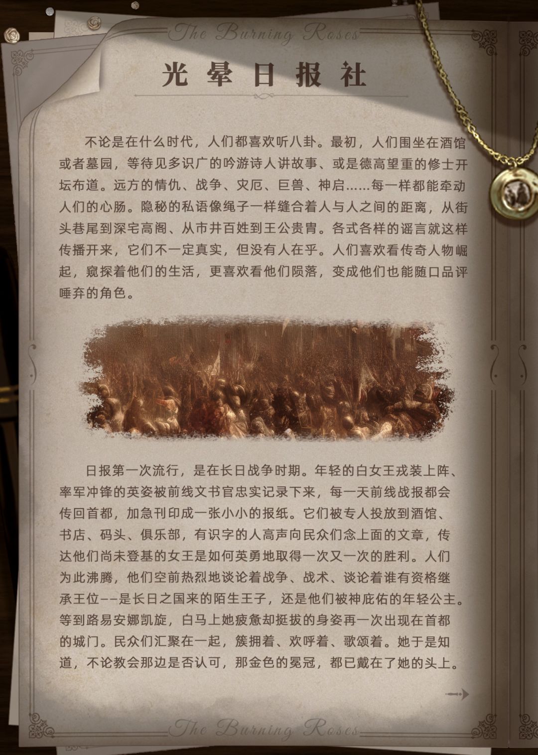 《光晕日报》是很不起眼的一家小报,却在数十年的争斗中屹立至今。它小小的版面不仅包括时政要闻、前线战事、潮流趋势,还有人们喜闻乐见的浪漫故事连载和笔锋辛辣的批评专栏,可以说是包罗万象。