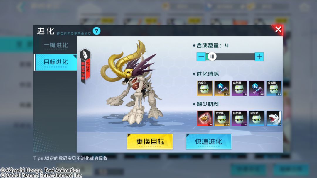 一键进化与此前功能相同;目标进化可指定数码宝贝批量进化,但需注意!只能指定完全体和究极体的数码宝贝,且不能指定通过进化培育获得的数码宝贝。