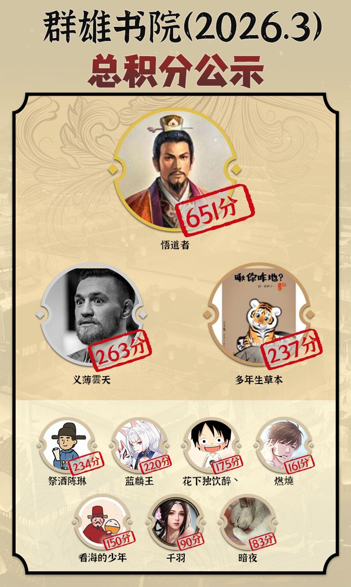 本期书院总积分统计了 2026年2月~3月 期间满足条件的Top 10主公们的总分情况,希望大家再接再厉,积极参与![[TapFamily庆生-万物皆可联动_好喜欢]](https://img-tc.tapimg.com/market/images/9ed255339c5dbbb0b966fb09ff06d495.gif)