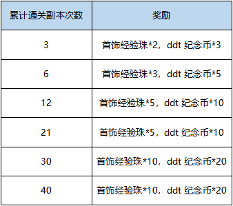 活动时间:1月5日00:00:00 - 1月11日23:59:59活动规则:活动期间,累计通关多人副本达到指定的次数,即可获得对应阶段的奖励。