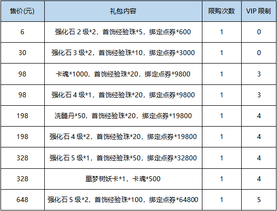 活动规则:消耗伤害5级礼包(累计消费获取)兑换强化石6级,限购1次
