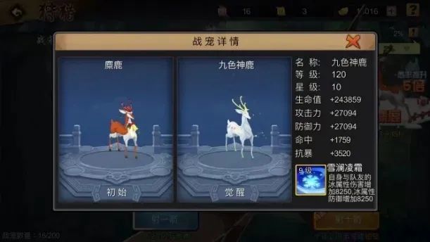 冰之专宠九色神鹿量体裁衣,为冰属性技能武将和冰系副本所定制,命中和抗暴的变异属性适用于任何武将,天赋专技放在冰属性技能见长的破盾武将上才能发挥出其最大效用!不论是作为主公主力级战宠、援护还是冰系副本破盾战宠,九色神鹿都值得托付!倘若赶上10倍概率获取,非常值得大家狠狠猎鹿一波!