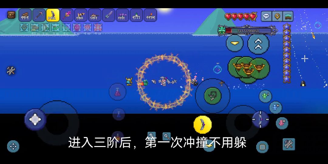 虽然他的接触伤害降低了,但是连续的快速冲刺会导致玩家被连续击中多次。注意他的攻击规律,并且不要站在原地不动。(除此之外,还应当远离第二阶段遗留的克苏鲁旋风,这可能需要略微控血,后面会提到如何避免同时面对二阶遗留的克苏鲁旋风和猪鲨的攻击)