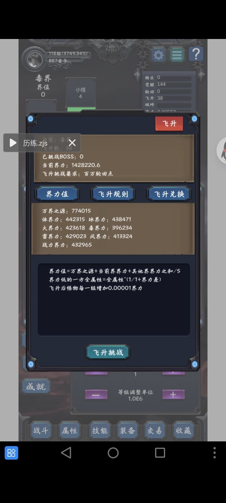 飞升后,7个界随机。飞到那个界,就只有那个属性有伤害(战力除外,都有伤害)。