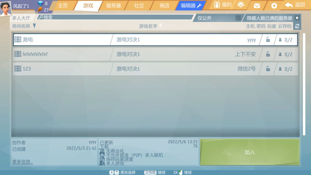 A:可以的,在游戏工坊界面中,点击多人大厅,即可看到创建多人游戏的房间,加入即可与其他岛主一起玩耍,当然你也可以选择自己创建房间等待其他玩家的加入。