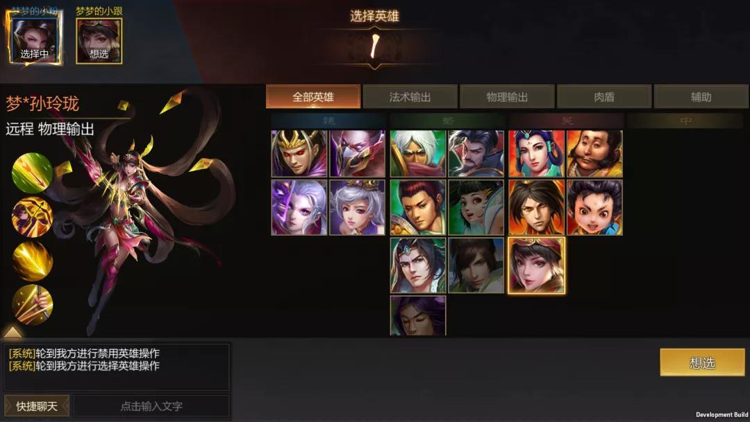 同样的,选择英雄后点击“想选”后。队友的界面中会出现“帮选”按钮,点击“帮选”后自动选择该英雄,另外,如果已经预选了英雄,则会直接变为“帮选”状态,不需要再多选择一次。