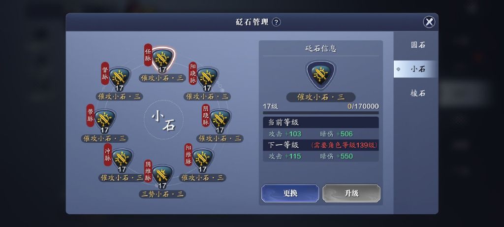 三角: 催攻小石催攻小石为最佳选择,月卡少侠可以考虑先以三势小石过渡,三势小石可以通过天魁币商店购买,每月限购2颗。