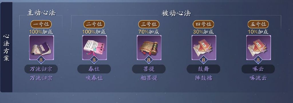 万流归宗+唤春住+杀菩提+阵鼓擂+啄流云对于新建号的少侠来说,最重要的是快速集齐5本紫色心法且升级到满级。在前期的PVP中最重要的就是防御。所以1、2号位置分别上唤春住和杀菩提,3、4号位上增加伤害的啄流云和阵鼓擂。