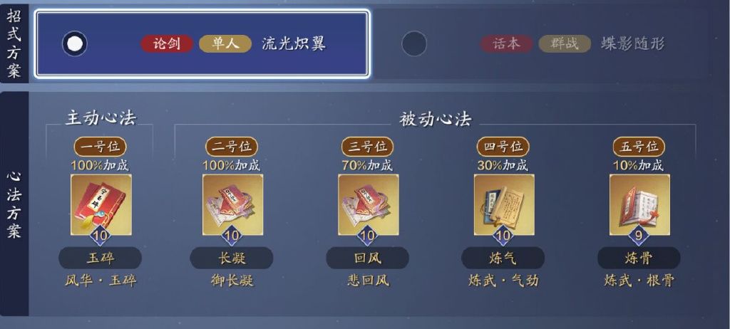 风华·玉碎+御长凝+悲回风+炼武·气劲+炼武·根骨/杀菩提这套心法是目前大部分32W+少侠的配置。可能少侠们的心法等级略有不同,但是组合都是大差不大的。这套组合完美的结合了攻守兼备——如果有两本练武那是最佳组合,如果没有也可以用杀菩提替代。当前主动心法也可以使用流毒,依据之前职业的主动心法是什么来做决定。