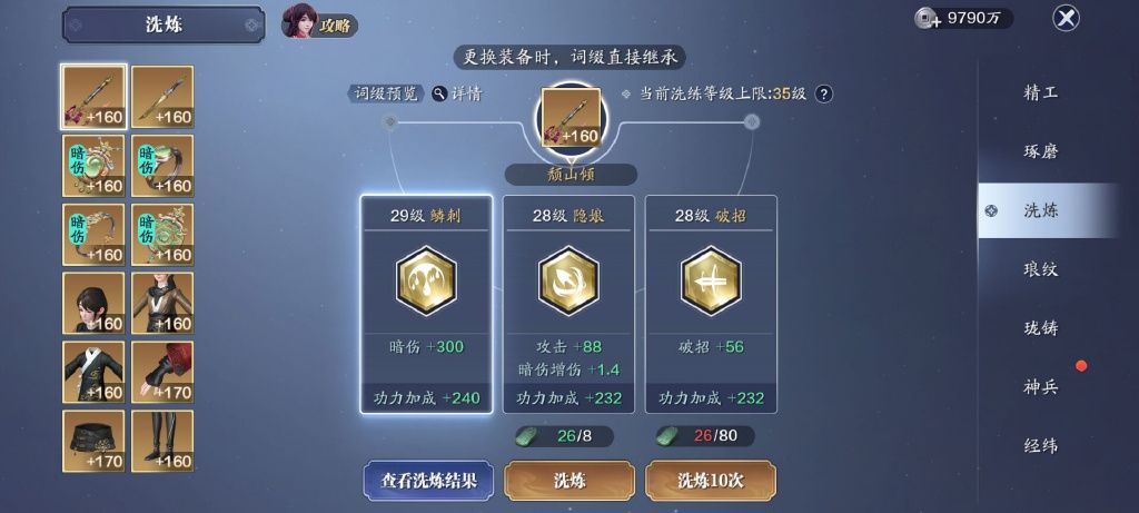 如果是转职的少侠,相信已经有一定的琅纹基础了,在琅纹的选择上以属性为主。尤其是PVP方向的少侠,重点投入放在琅纹上绝对没错。这套琅玟组合也是现在32W+功力以上主流的琅纹选择,总共有27个188的琅纹,将无用的金色琅纹已经剔除掉了,换成了能增加破招的琅纹,也是除了使用道心/神人顶级氪金大佬之外的首选。