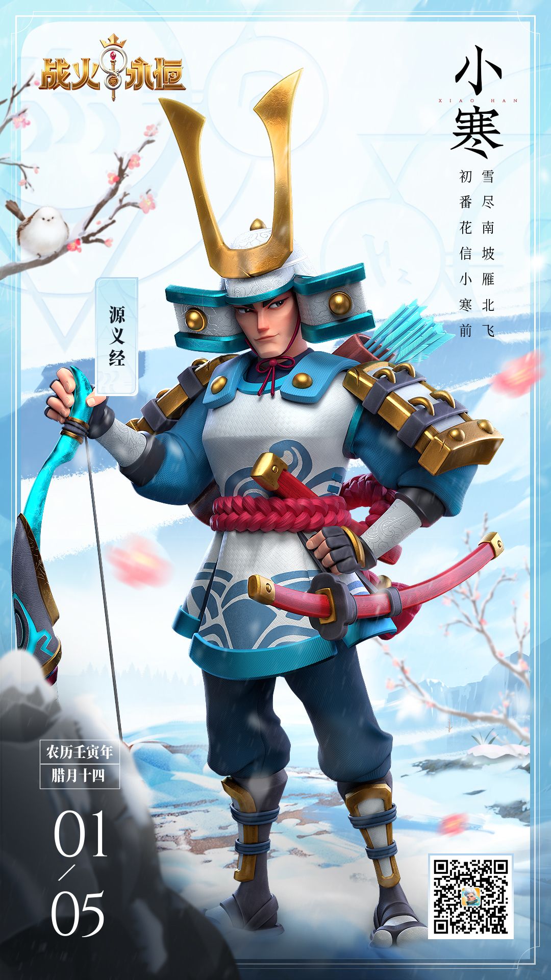 这次的节气专栏我们邀请到了平安时期的将领源义经。他身穿印有湛蓝浪花纹饰的铠甲,内搭羽织,头戴日本武士兜,手持冰晶弓,身后的箭筒里装满了冰晶箭矢。果然武士身体强健不怕冷呢,不像海伦裹得像只熊。他身后有淡粉色的梅花飘落。源义经也是来踏雪寻梅的吗?