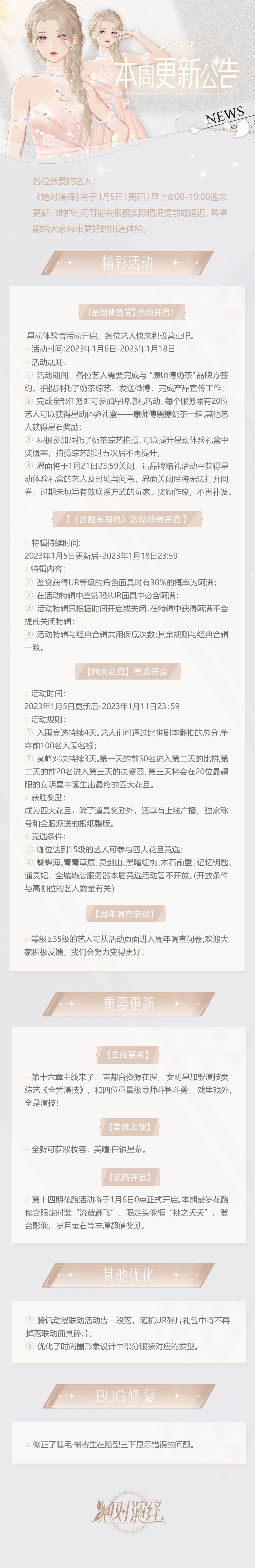 《绝对演绎》将于1月5日(周四)早上8:00-10:00迎来更新,维护时间可能会根据实际情况提前或延迟,希望能给大家带来更好的出道体验。